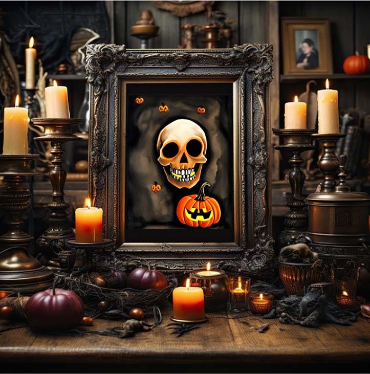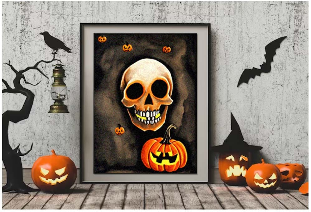 Digitally coloured Skull and Pumpkin- Dark artwork in deep tones.
