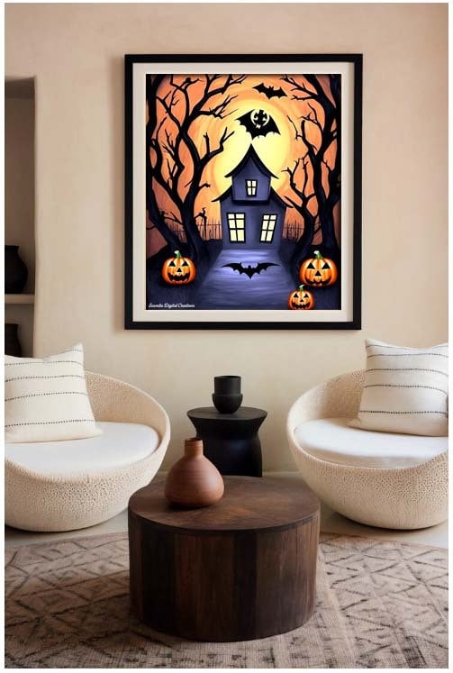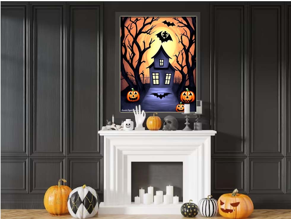 Digitally coloured Haunted House with Pumpkins Art Print- Dark artwork in deep tones.